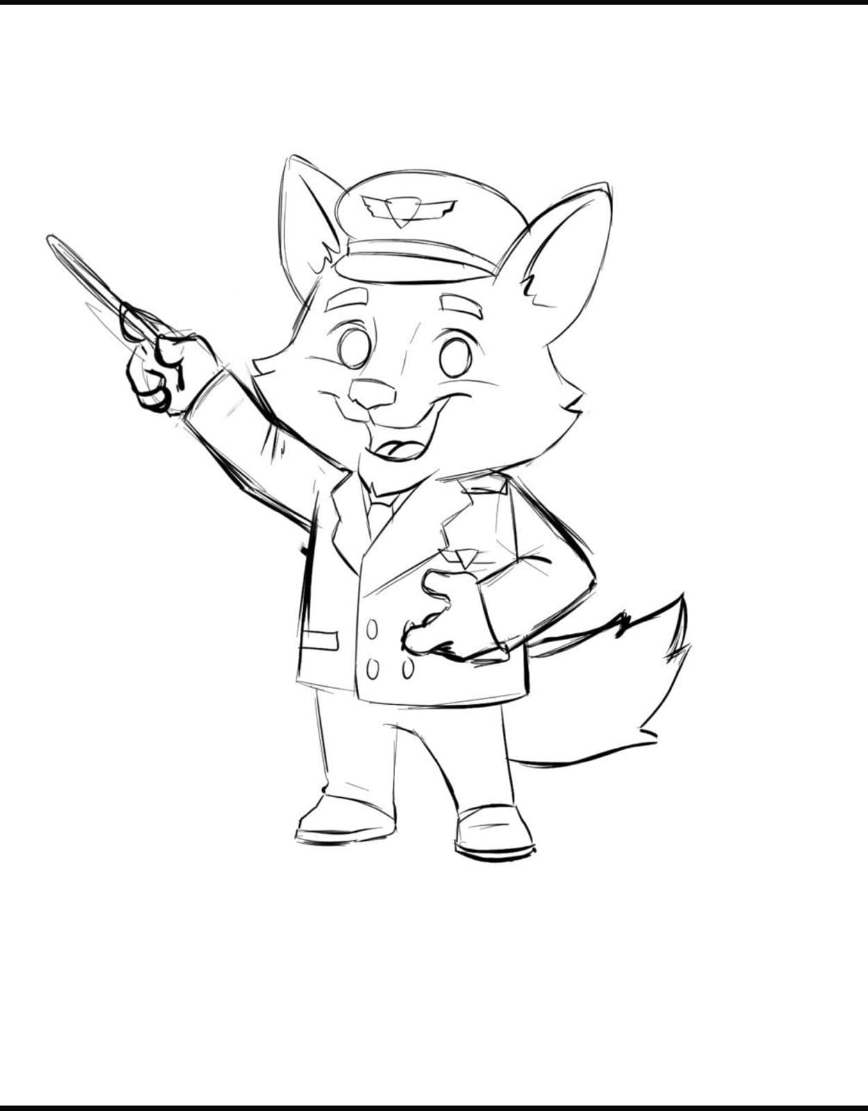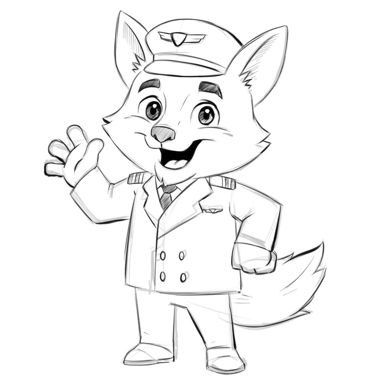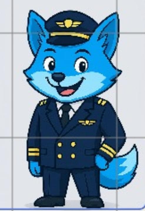 After a few sessions of back-and-forth, our mascot was born: a blue fox. And almost immediately — like, within minutes — someone said "what if he wore a pilot uniform?" And that was it. No debate. Of course he wears a pilot uniform.